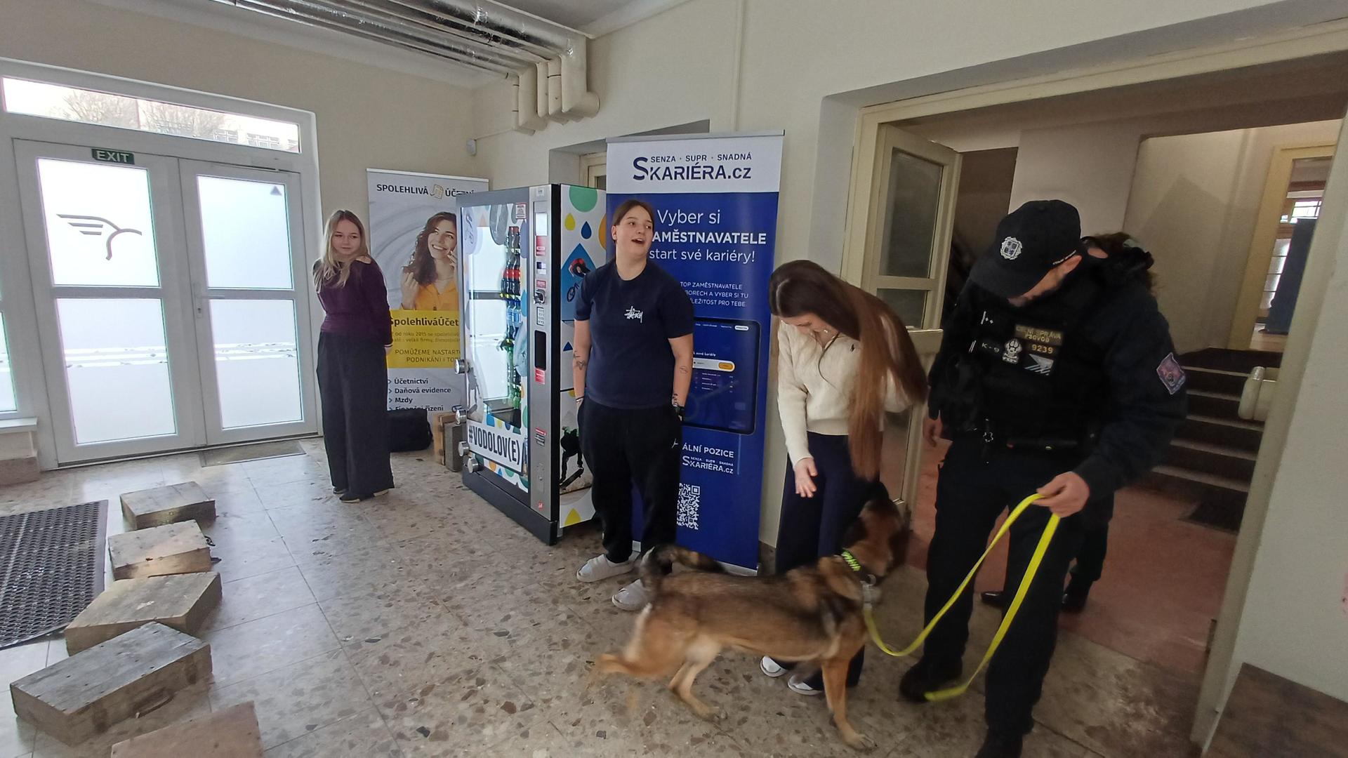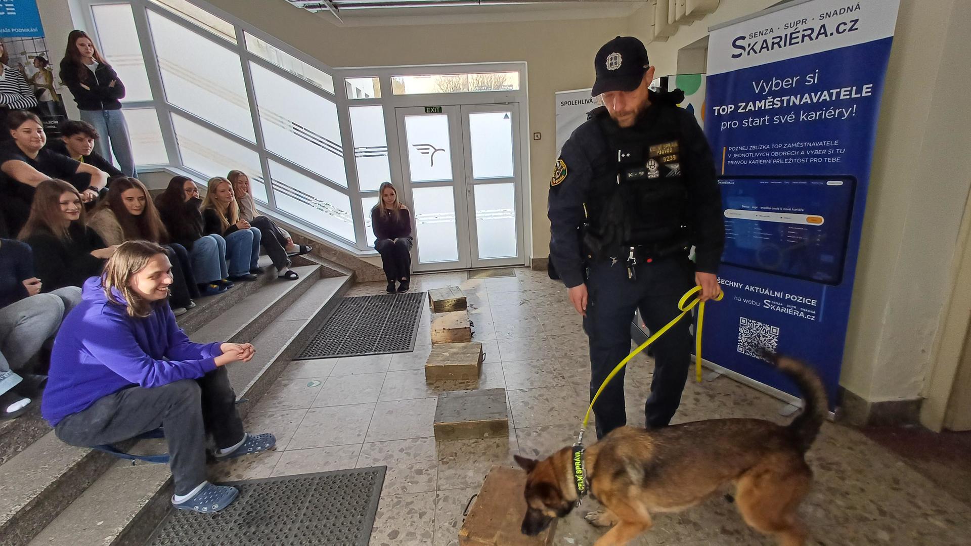 Atraktivní součástí programu byla i ukázka práce služební kynologie. Besedy se zúčastnil psovod se služebním psem, který předvedl, jakým způsobem dokáže pes vyhledávat nelegální zboží. Studenti se dozvěděli, jak probíhá dlouhodobý výcvik, jaké schopnosti jsou u služebních psů nejdůležitější a jak silné pouto mezi psovodem a psem musí vzniknout, aby byli při zásazích úspěšní.