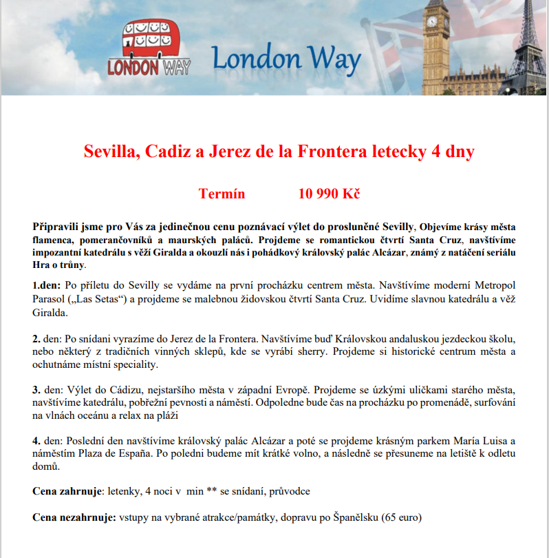 (Cena nezahrnuje vstupy do památek a dopravu po Španělsku – cca 65 €)