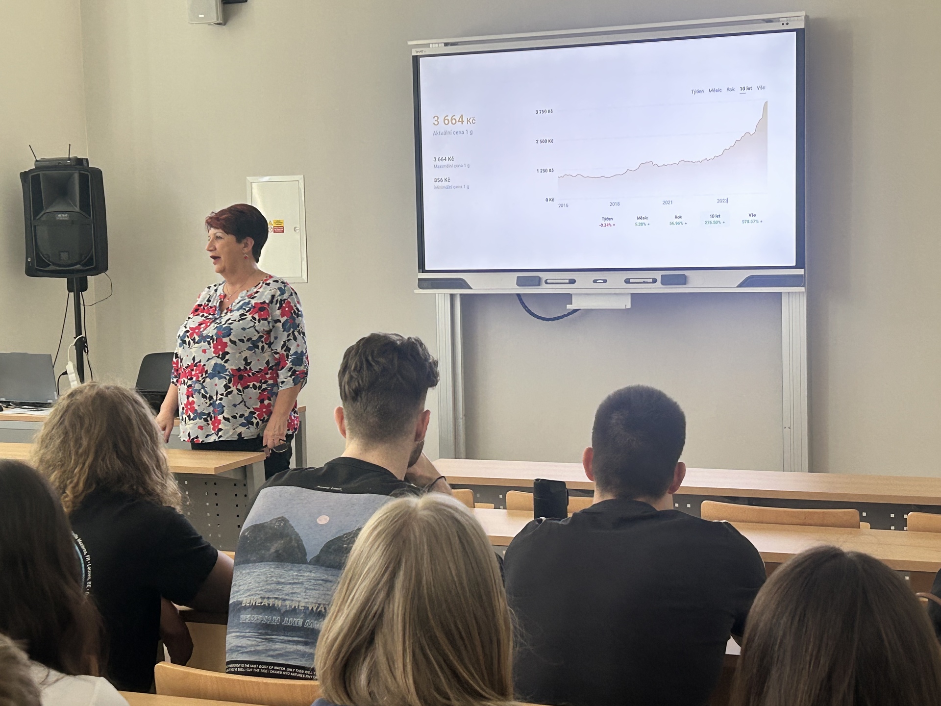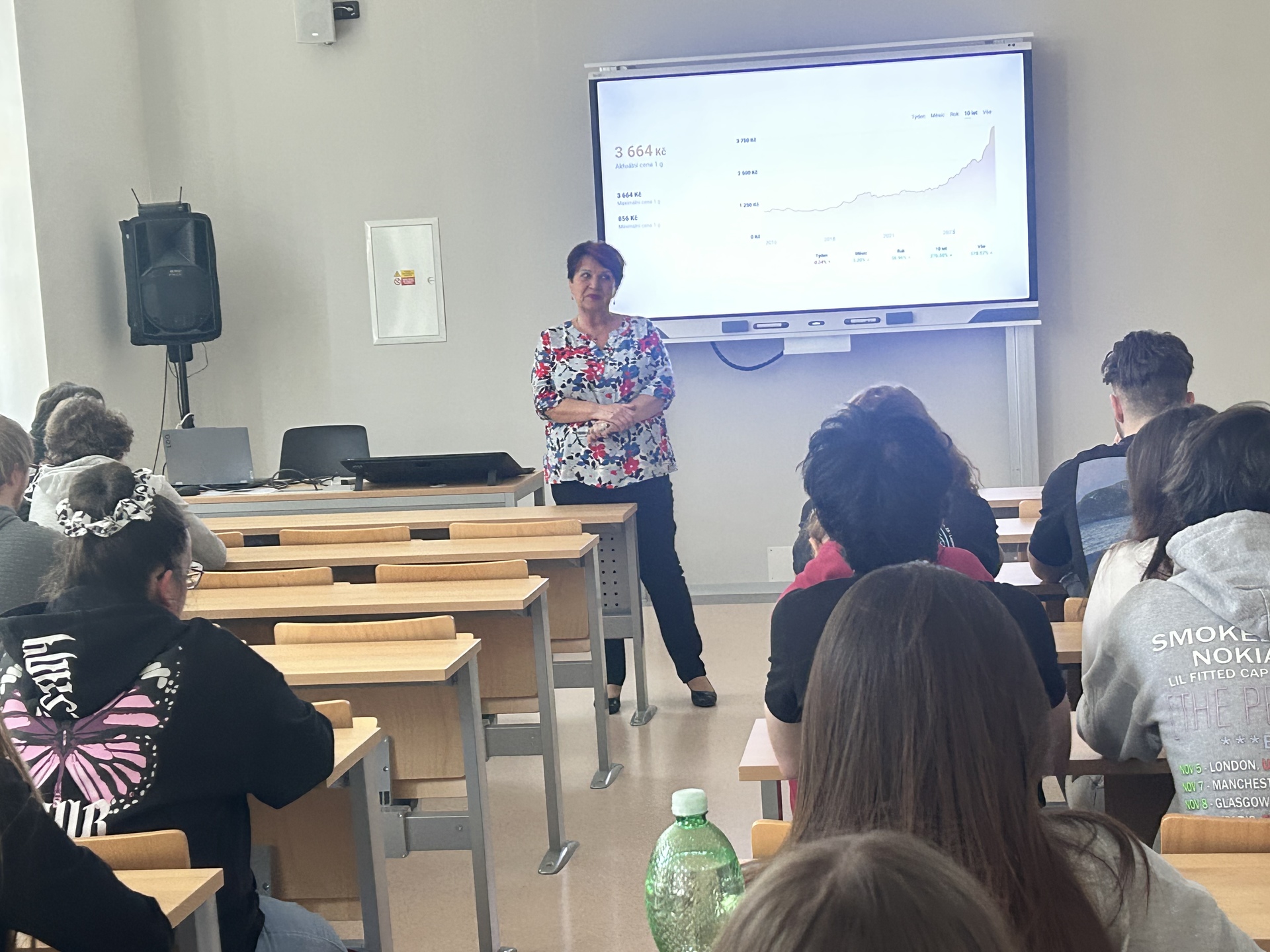 Seminář vedla oblastní manažerka paní Cruseová, která studentům srozumitelnou formou představila základní principy investování do drahých kovů. Ve svém vystoupení se zaměřila nejen na výhody investic do zlata, ale také na rizika a zásady odpovědného investičního rozhodování, které jsou důležité jak pro začínající investory, tak pro běžný osobní finanční život.