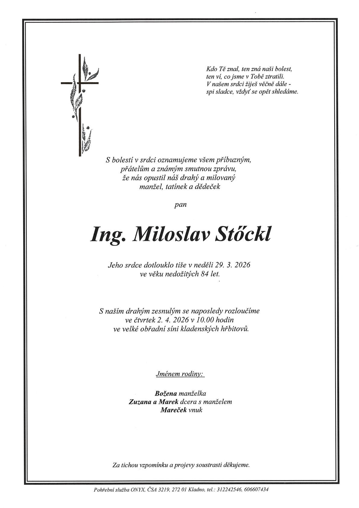 S hlubokou lítostí oznamujeme, že nás navždy opustil Ing. Miloslav Stöckl, bývalý dlouholetý ředitel slánské obchodní akademie. Po řadu let stál v čele školy a významně se podílel na jejím rozvoji, odborném směřování i dobrém jménu mezi odbornou i širokou veřejností.