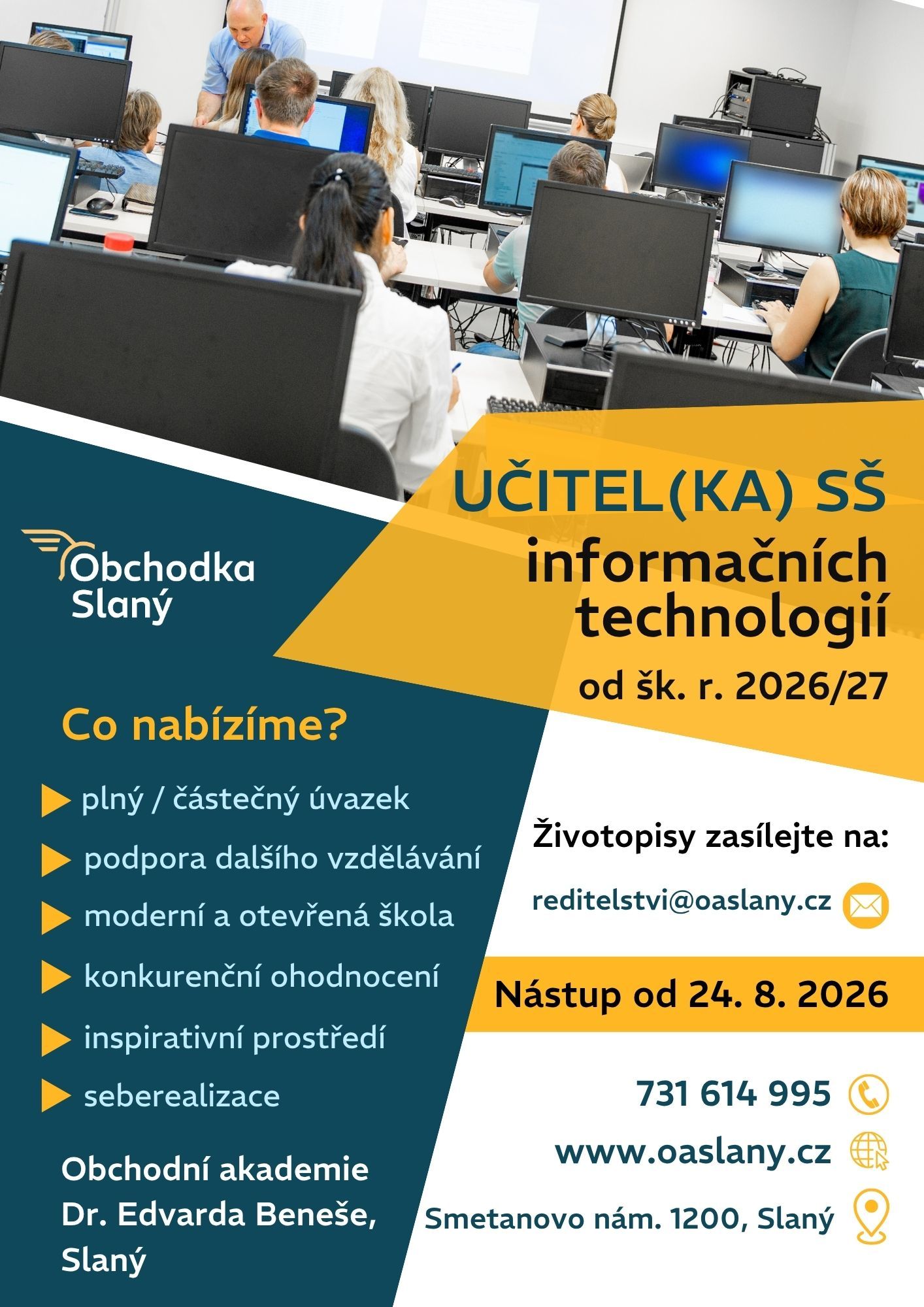 Sháníme do našeho kolektivu nadšené kolegyně, kolegy, kteří chtějí předávat své zkušenosti a znalosti žákům, kteří se chtějí učit novým efektivním metodám výuky a moderním trendům hodnocení žáků. Staňte se součástí našeho týmu!