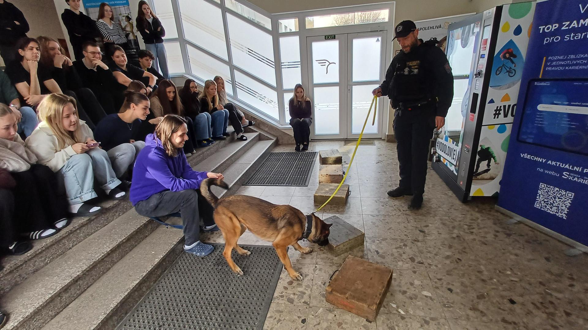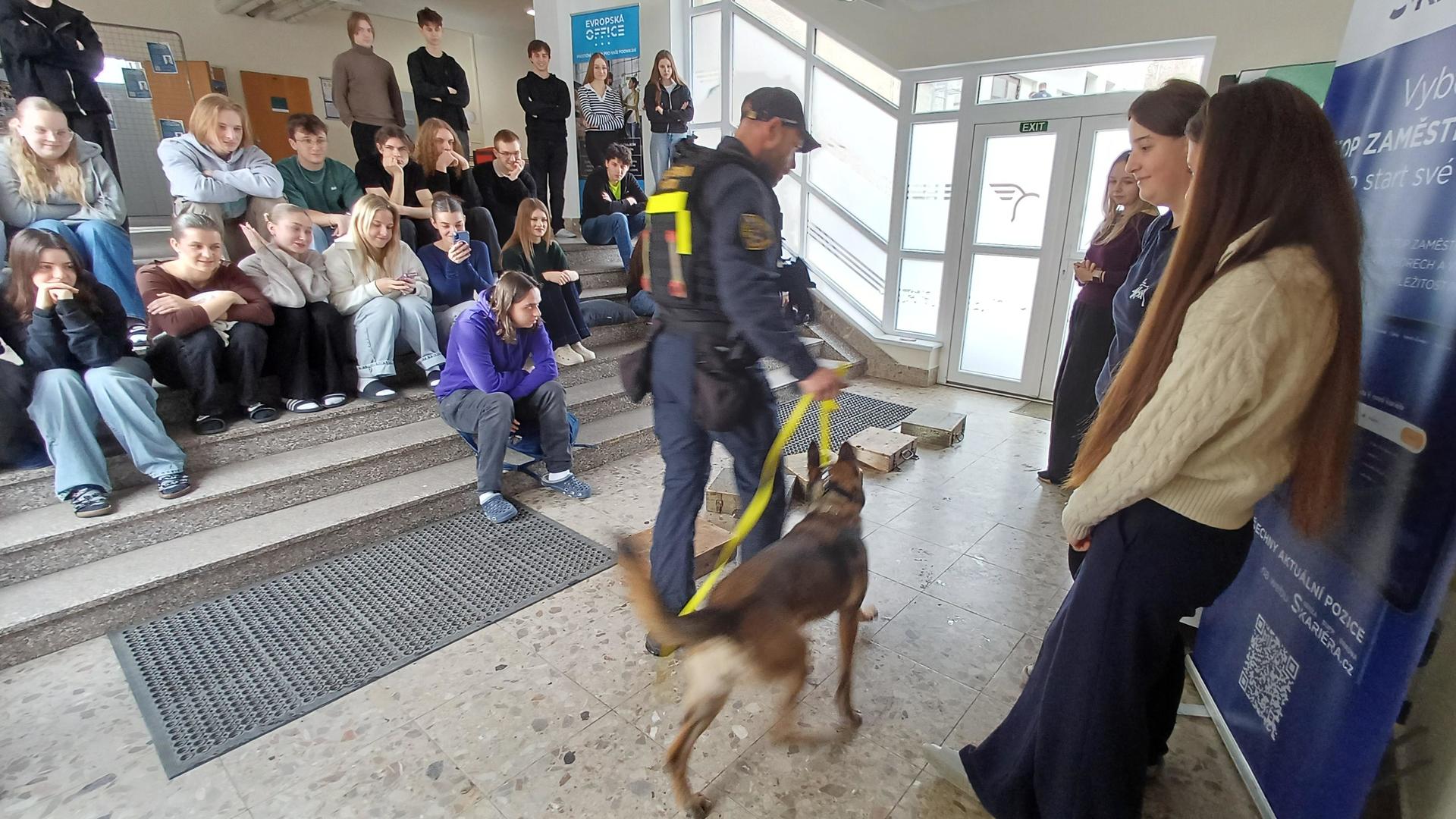 Atraktivní součástí programu byla i ukázka práce služební kynologie. Besedy se zúčastnil psovod se služebním psem, který předvedl, jakým způsobem dokáže pes vyhledávat nelegální zboží. Studenti se dozvěděli, jak probíhá dlouhodobý výcvik, jaké schopnosti jsou u služebních psů nejdůležitější a jak silné pouto mezi psovodem a psem musí vzniknout, aby byli při zásazích úspěšní.