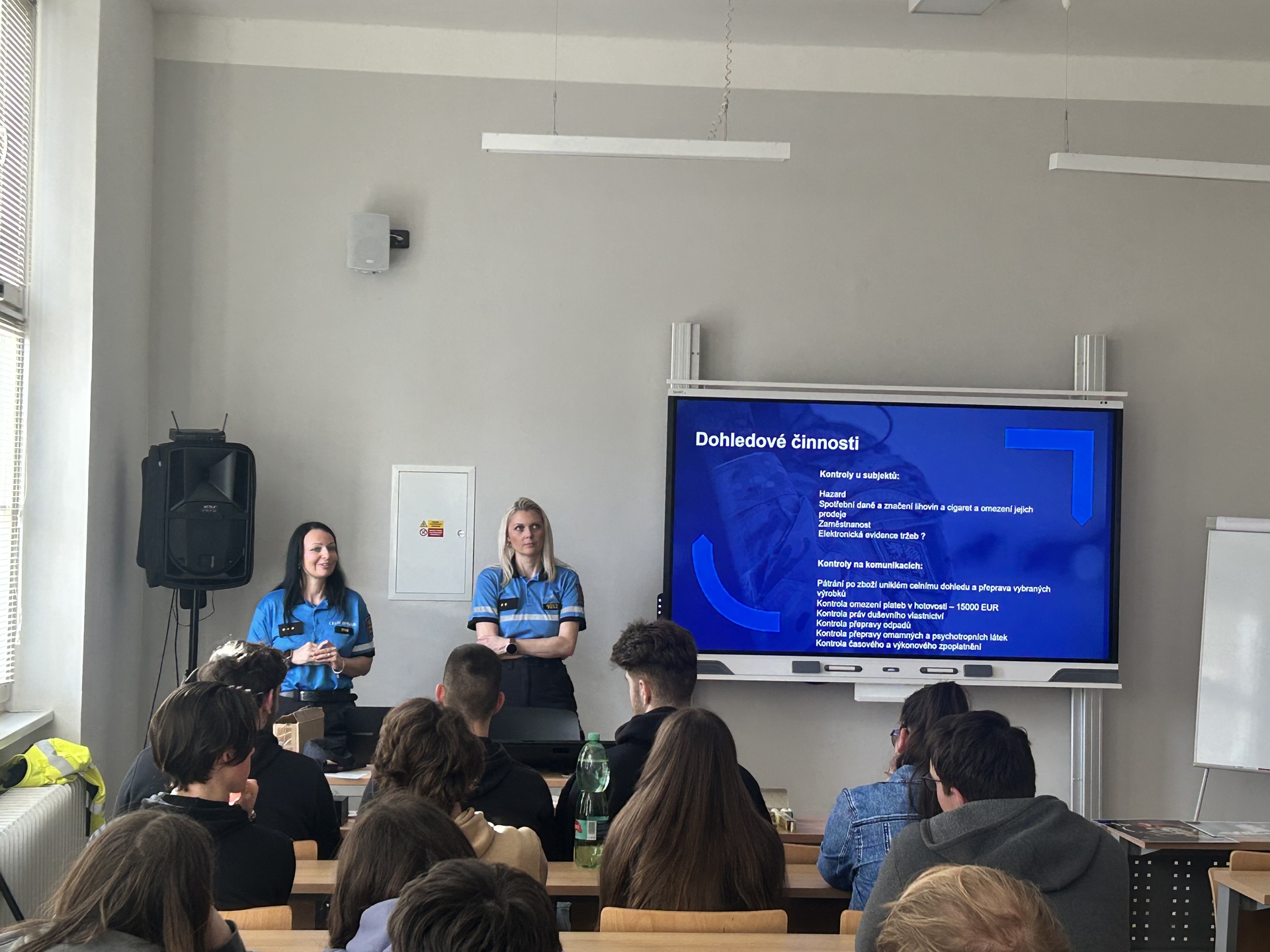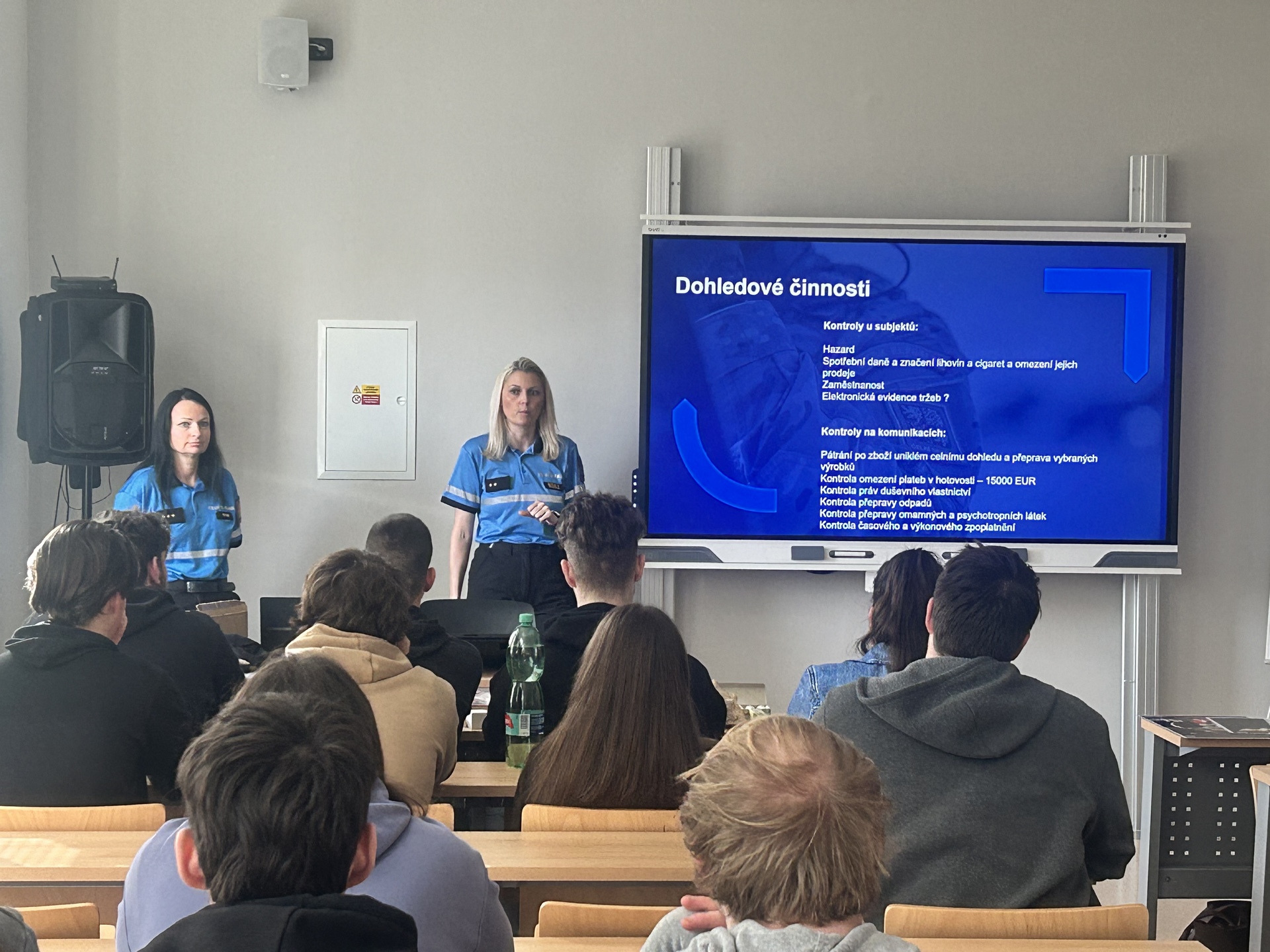 Naši maturanti měli možnost zúčastnit se besedy se zaměstnanci Celního úřadu pro Středočeský kraj, kteří jim přiblížili široké spektrum činností spadajících pod Celní správu České republiky. Hned v úvodu přednášející uvedli, že práce celníka není jen o kontrolách na hranicích či silnicích, ale zahrnuje také rozsáhlou administrativní agendu a odpovědnost spojenou s dodržováním zákonných předpisů.