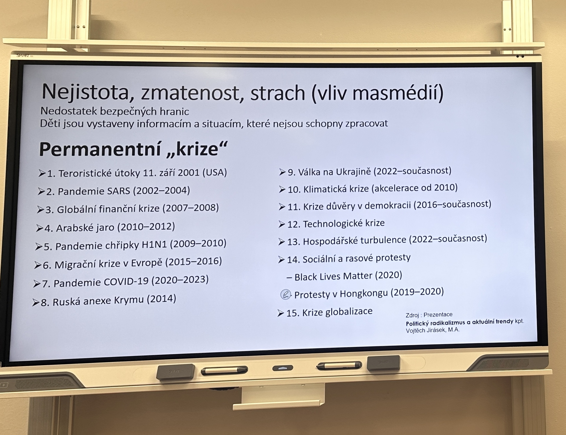 Přednáška reagovala na skutečnost, že radikalizace u mladistvých je v posledních letech stále častějším tématem nejen v České republice, ale i v evropském prostoru. Policie ve své prezentaci upozornila, že radikalizace u dětí nevychází vždy z ideologického přesvědčení – mnohem častěji je důsledkem osobního traumatu, šikany, sociální izolace či hlubší frustrace. Násilí pak může být dítětem vnímáno jako legitimní způsob řešení vnitřního konfliktu.
