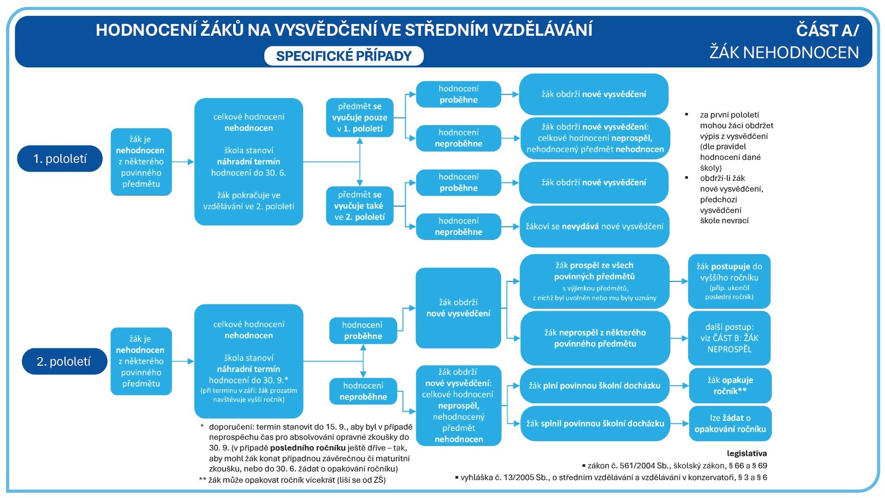 Nelze-li žáka hodnotit na konci prvního pololetí, určí ředitel školy pro jeho hodnocení náhradní termín, a to tak, aby hodnocení za první pololetí bylo provedeno nejpozději do konce června. Není-li možné žáka hodnotit ani v náhradním termínu, žák se za první pololetí nehodnotí. Není-li žák hodnocen z povinného předmětu vyučovaného pouze v prvním pololetí ani v náhradním termínu, neprospěl.