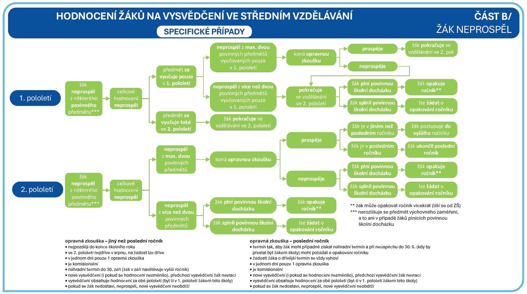 Žák, který na konci druhého pololetí neprospěl nejvýše ze 2 povinných předmětů, nebo žák, který neprospěl na konci prvního pololetí nejvýše ze 2 povinných předmětů vyučovaných pouze v prvním pololetí, koná z těchto předmětů opravnou zkoušku nejpozději do konce příslušného školního roku v termínu stanoveném ředitelem školy. Opravné zkoušky jsou komisionální.